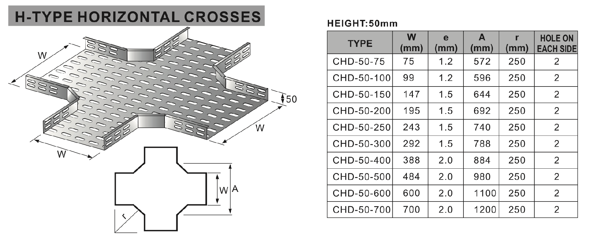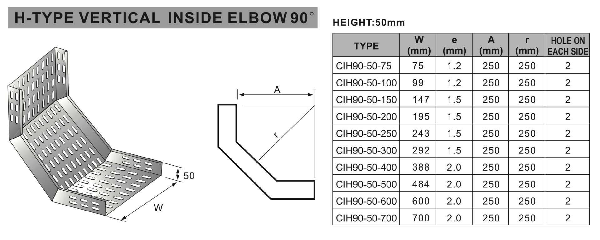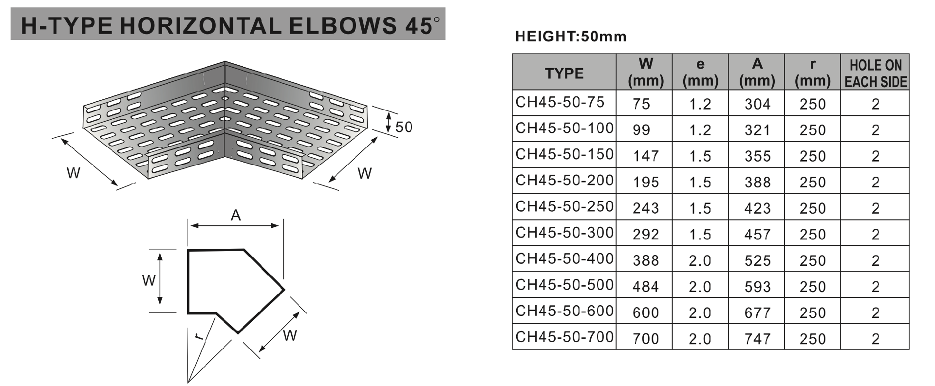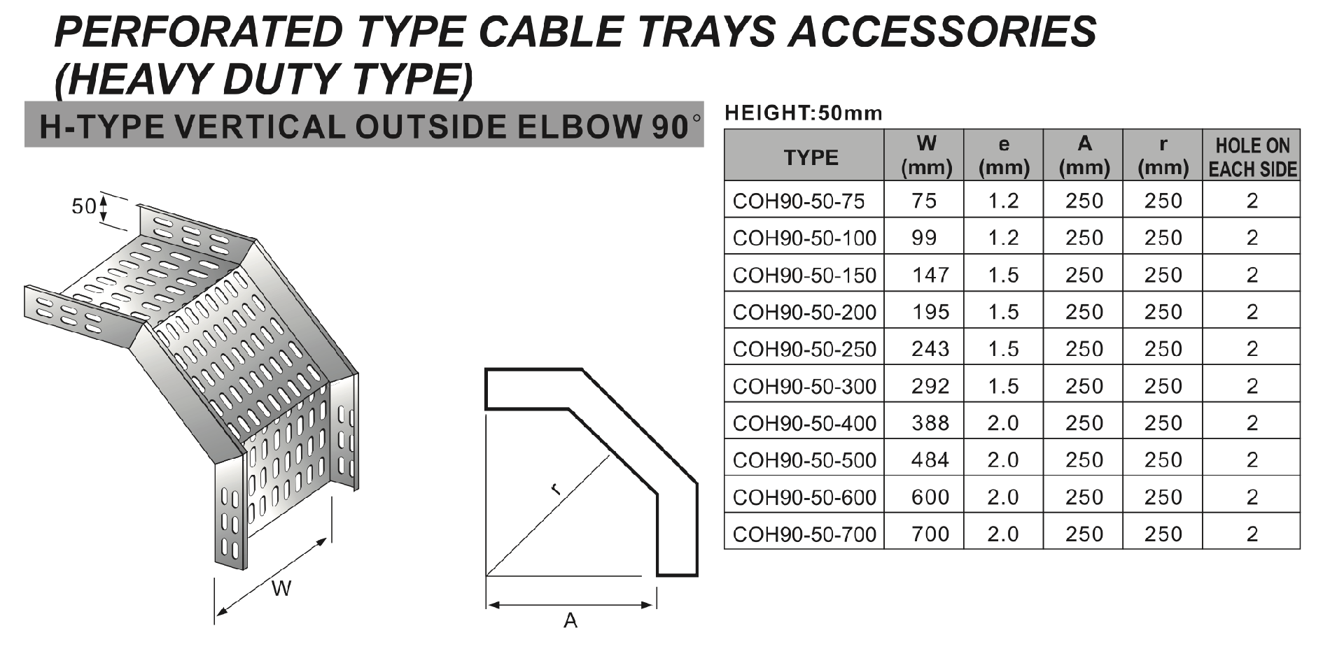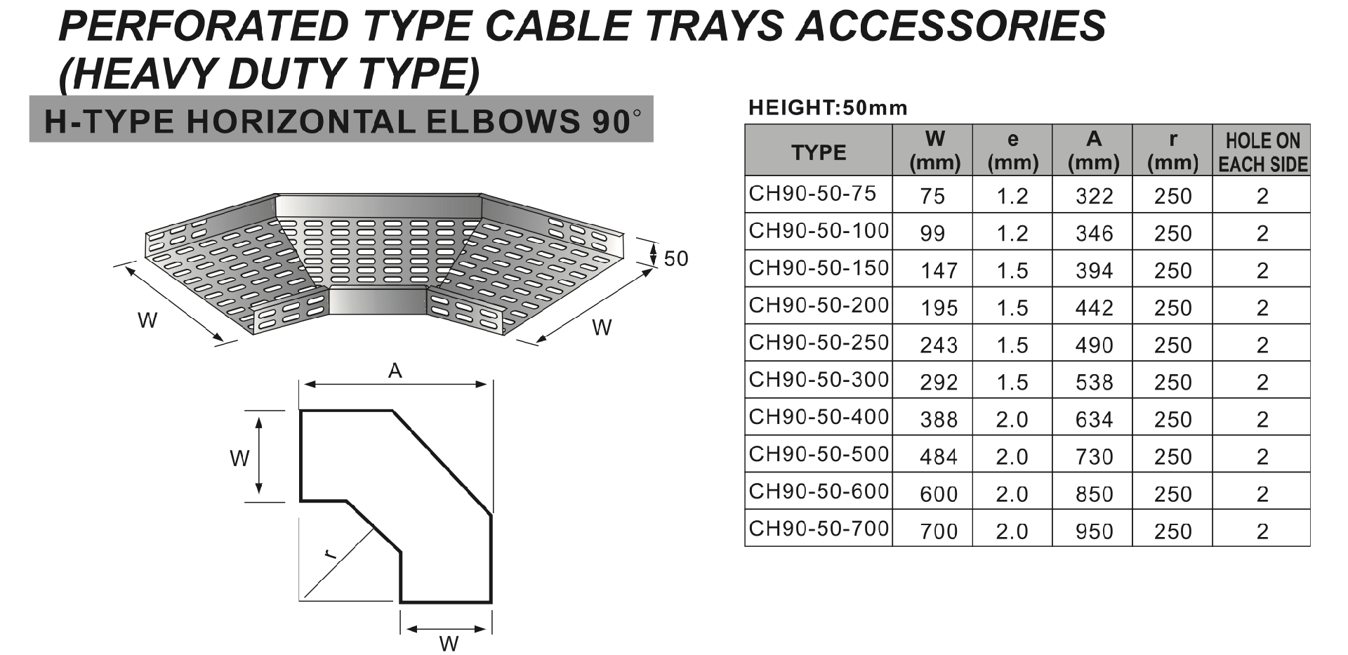 This heavy-duty horizontal elbow is engineered to seamlessly change the direction of cable runs by 90 degrees. Featuring a standard 50mm side height, it is compatible with various tray widths (W) to suit diverse installation needs. The perforated design ensures optimal air circulation for cable cooling and offers flexible anchor points for cable ties. Constructed for durability and easy alignment, this fitting simplifies corner routing in commercial and industrial electrical management systems.