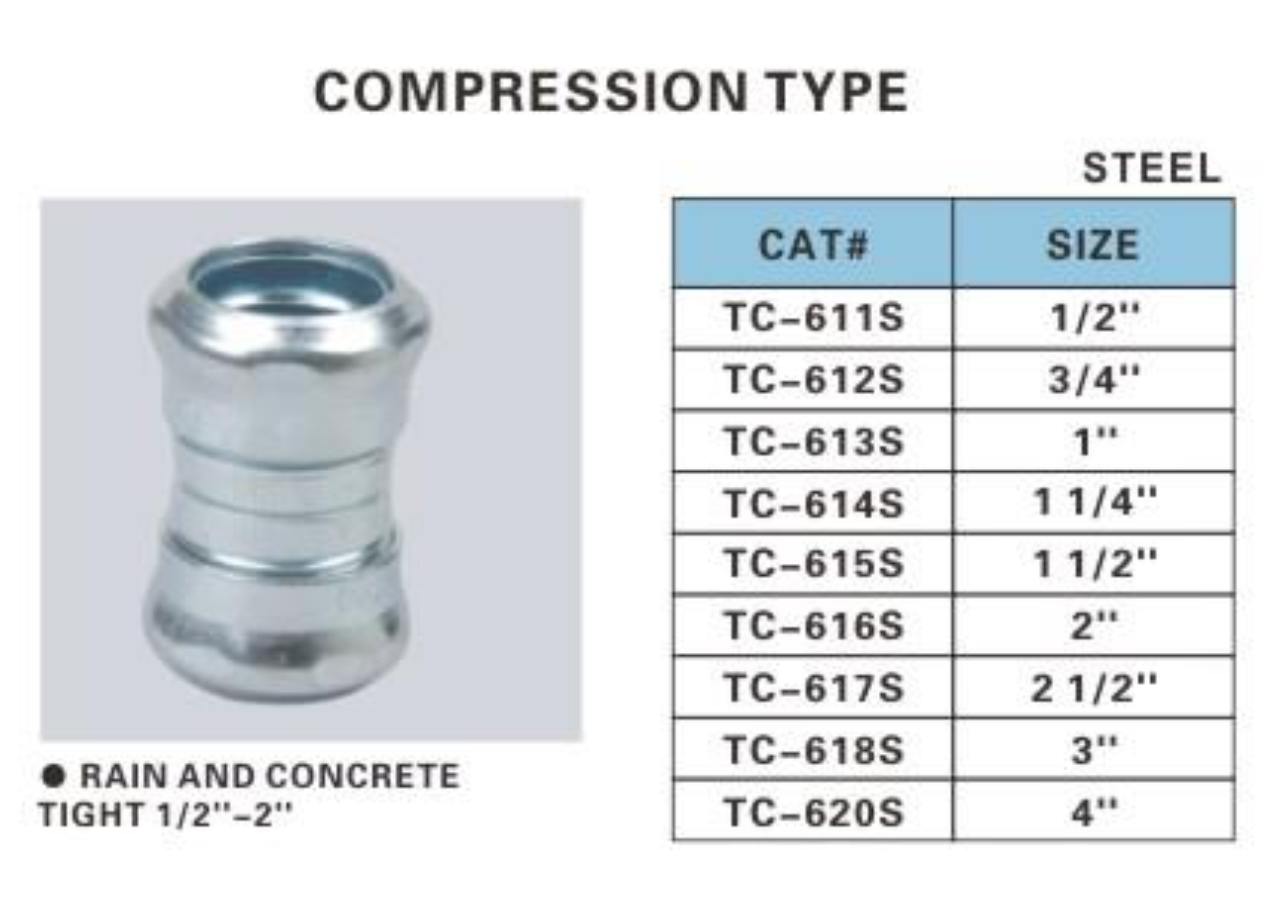 EMT COUPLING COMPRESSION TYPE STEEL SIZE CHART FROM 1/2" TO 4"