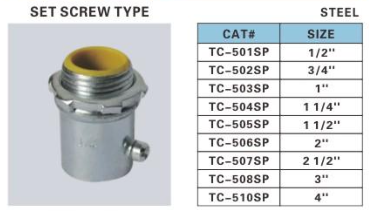 EMT CONNECTORS INSULATED SET SCREW TYPE STEEL SIZE CHART FROM 1/2" TO 4"