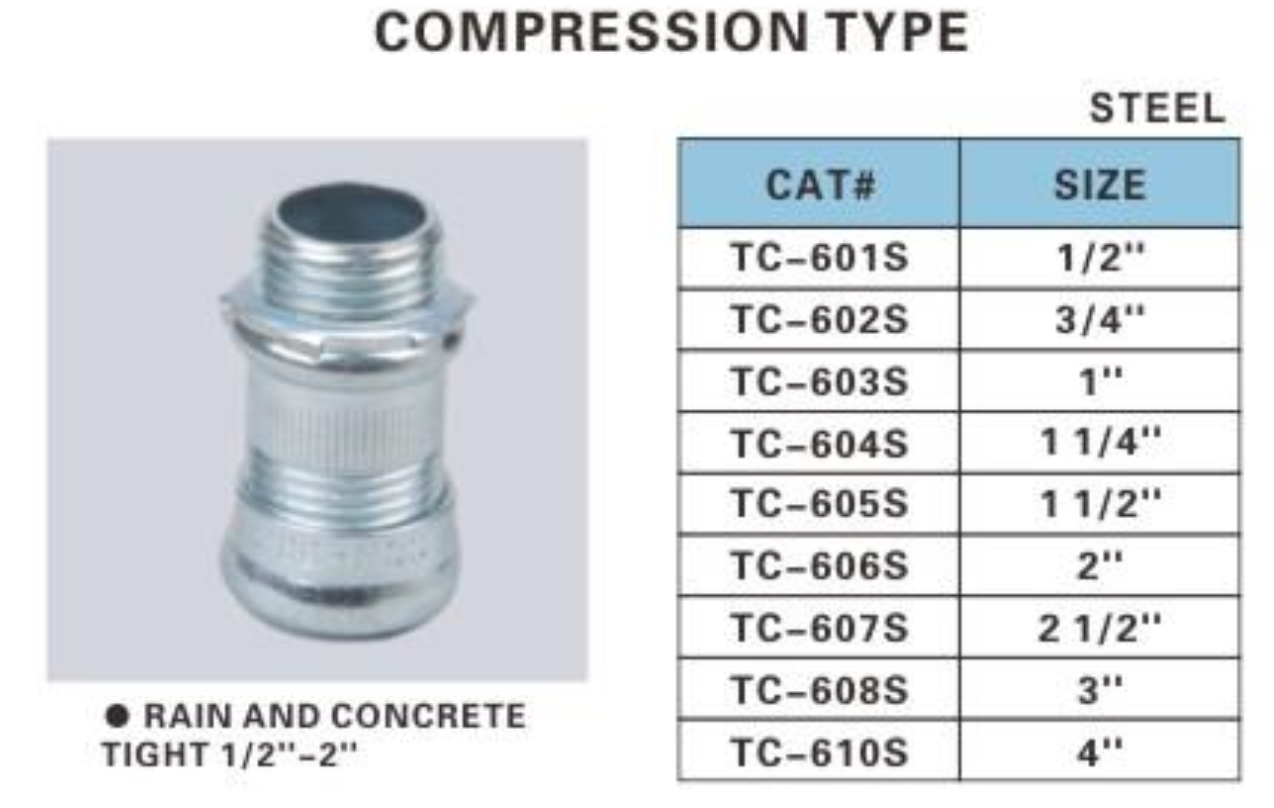 EMT CONNECTORS COMPRESSION TYPE STEEL SIZE CHART 1/2"~4"