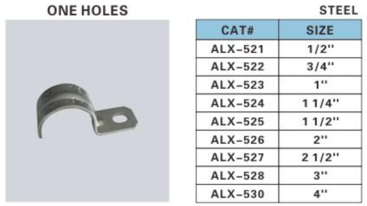 ALEX® One Hole EMT Straps are designed to securely fasten Electrical Metallic Tubing (EMT) to various surfaces. Made from high-quality steel, these straps offer excellent durability and resistance to corrosion, making them ideal for a variety of electrical installations.