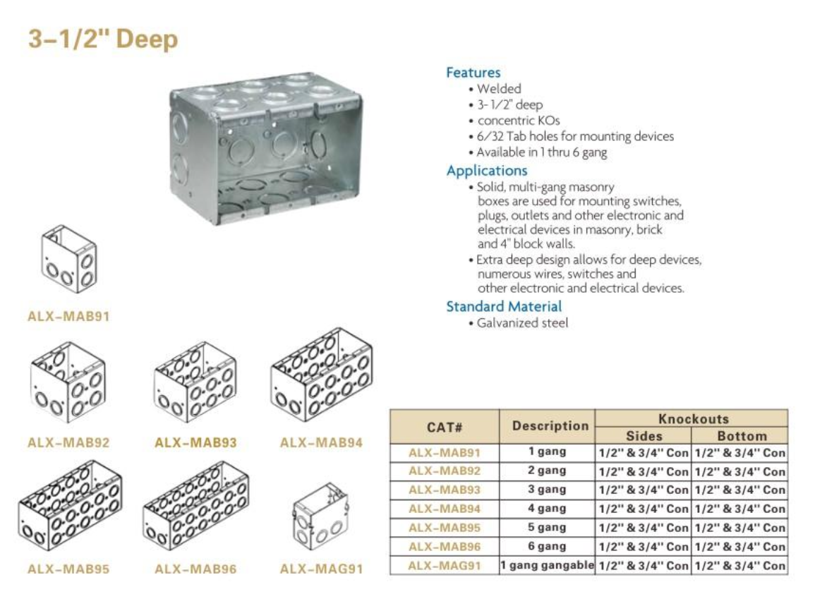 ALEX® Masonry Boxes are designed for mounting switches, plugs, outlets, and other electronic and electrical devices within masonry, brick, and 4" block walls. These welded, solid boxes are available in both 2-1/2" and 3-1/2" depths to accommodate a variety of installation needs, from 1 gang to 6 gang configurations. The boxes feature concentric knockouts (KOs) and 6/32 tab holes, ensuring ease of device mounting. The extra-deep design also allows for the inclusion of deep devices, numerous wires, switches, and other electronic equipment.