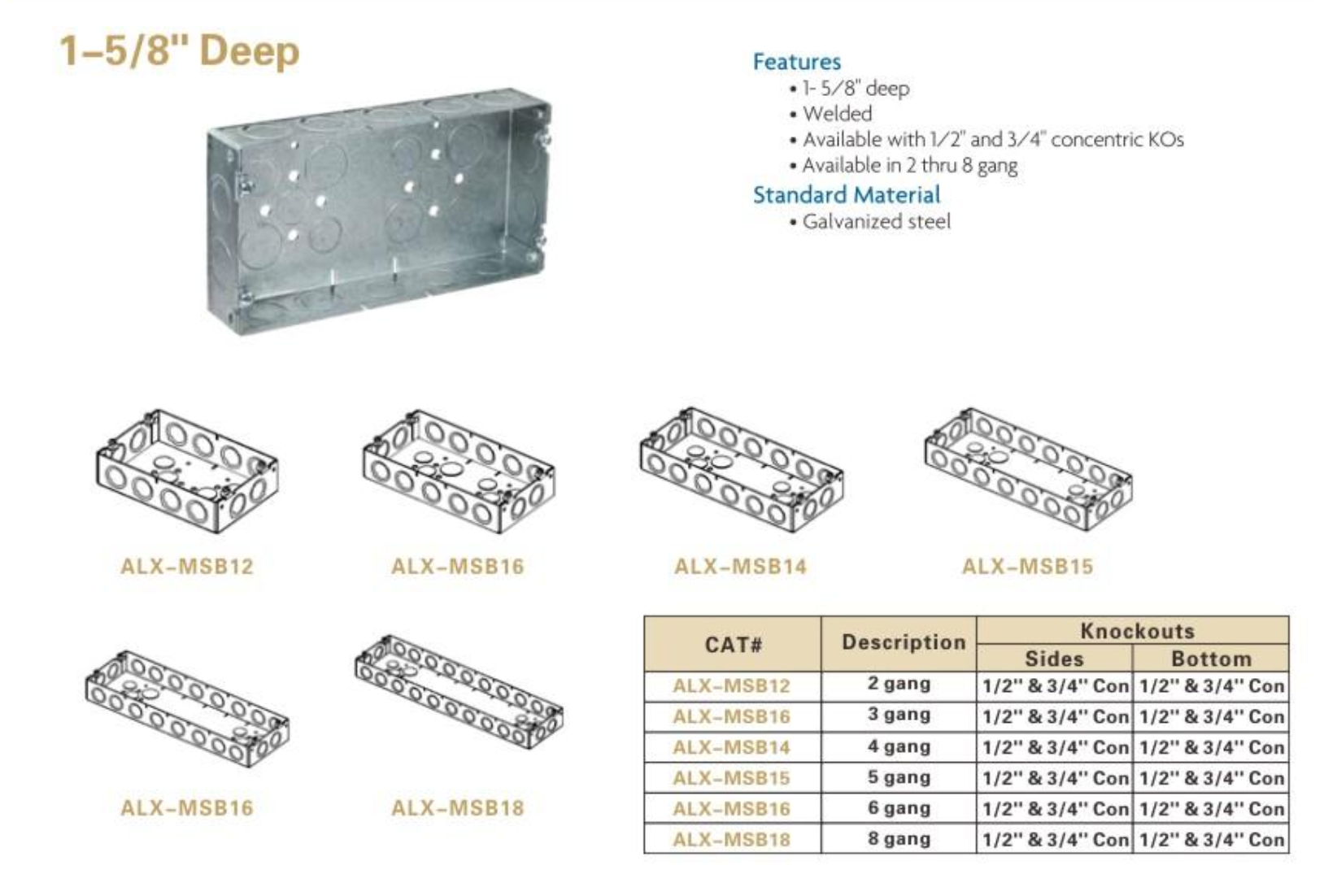 ALEX® Multi-Gang Switch Boxes are designed for installations where more than two devices or outlets are required in one box. Available in both 1-5/8" and 2-1/2" depths, these welded boxes offer versatility for various electrical applications. With concentric knockouts (KOs) for 1/2" and 3/4" conduits, these boxes can accommodate 2 to 8 gang configurations, making them ideal for walls or ceilings where multiple lighting fixtures, switches, receptacles, or other outlet devices are needed.