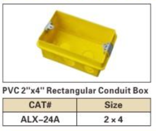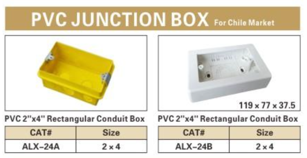 Description: ALEX® PVC 2"×4" Rectangular Conduit Boxes are specifically designed for the Chile market, providing durable and reliable housing for electrical connections. These boxes are made from high-quality PVC, ensuring resistance to corrosion and harsh environmental conditions. Available in both yellow and white variants, these boxes are perfect for a variety of electrical installations.