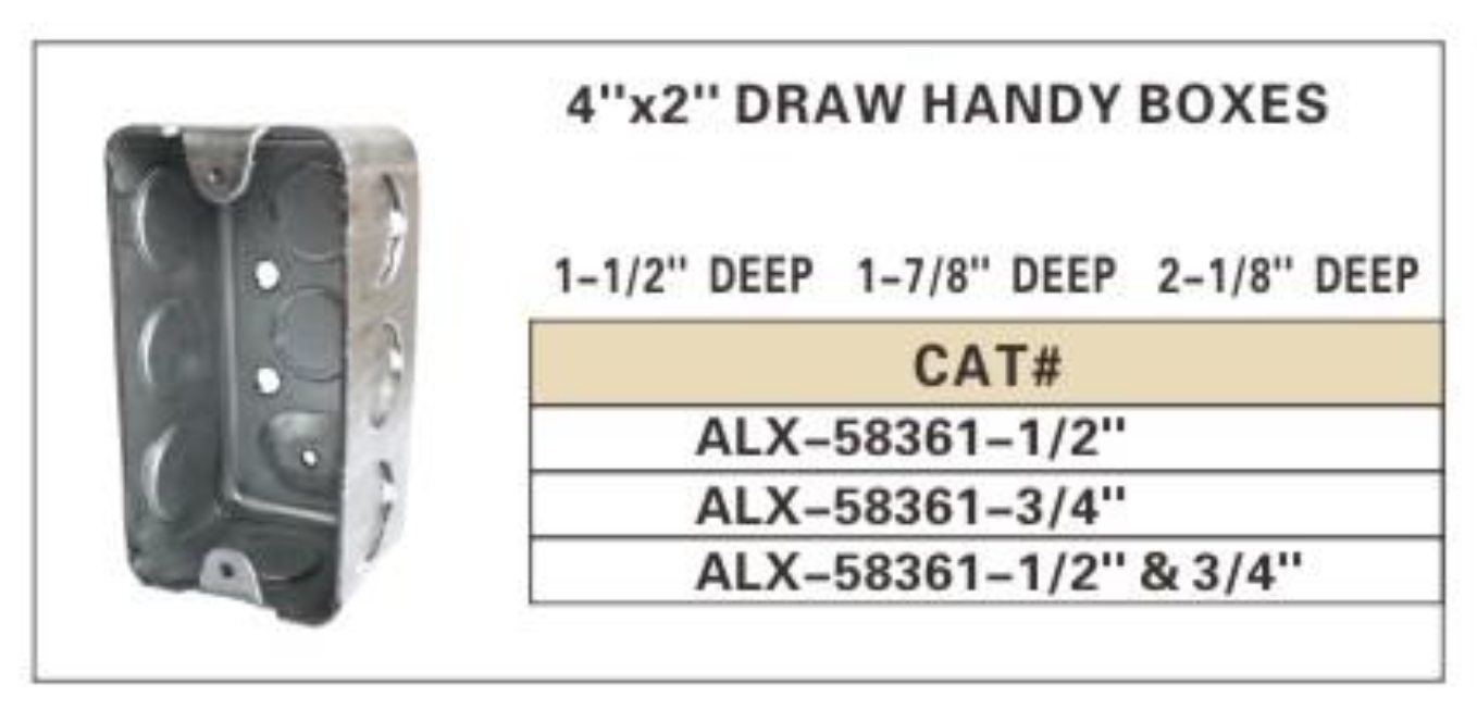 ALEX® Rectangular Conduit Boxes - Draw Handy Boxes are essential for securely housing electrical wiring and devices within walls. Available in various depths, these boxes are designed for easy installation and provide ample space for electrical connections. The sturdy construction ensures reliable performance, making them suitable for a wide range of electrical applications in both residential and commercial settings.