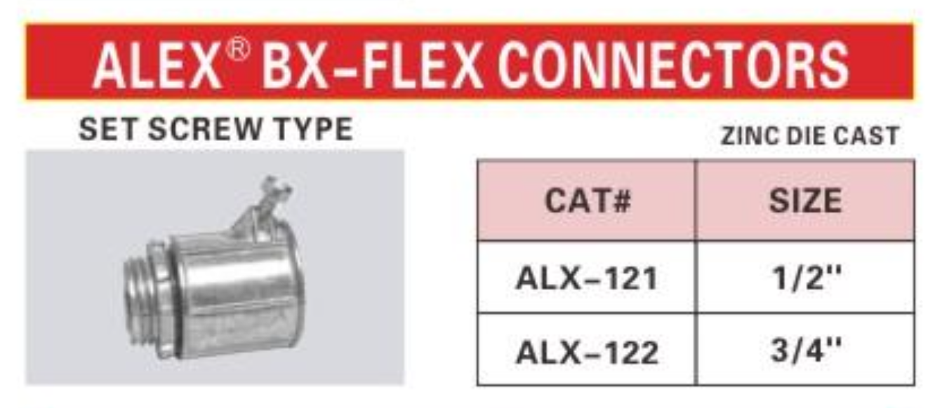 ALEX® BX-Flex Set Screw Type Connectors are designed for securing BX and flexible metal conduits (FMC) to electrical boxes or enclosures. These connectors feature a reliable set screw mechanism, ensuring a secure and stable connection. Constructed from high-quality zinc die-cast, they provide durability and long-lasting performance, making them an excellent choice for a variety of electrical applications.