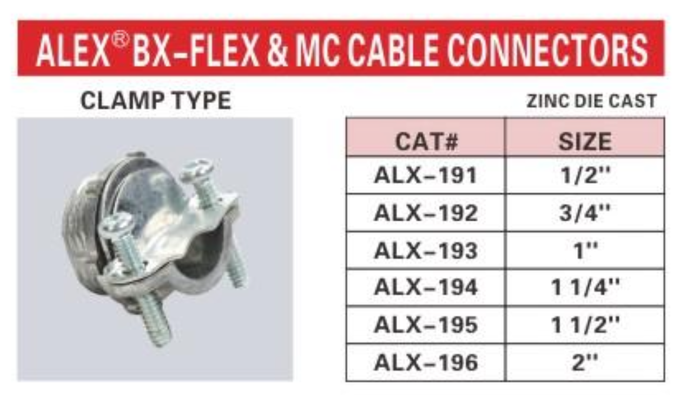 ALEX® BX-Flex & MC Cable Connectors - Clamp Type are designed to secure BX-Flex and MC (Metal Clad) cables to electrical boxes or enclosures. Made from high-quality zinc die-cast, these connectors ensure a durable and reliable connection, providing robust support for various electrical installations. The clamp design allows for easy installation and a secure fit, making them an essential tool for professional electricians.