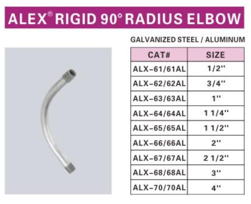 ALEX® Rigid 90° Radius Elbows are designed to provide a smooth and precise bend for rigid conduits at a 90-degree angle, ensuring optimal direction changes in electrical conduit systems. Available in galvanized steel or aluminum, these elbows are ideal for maintaining the integrity and flow of your electrical installations.