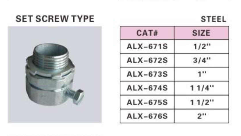 ALEX® Rigid Connectors - Set Screw Type are designed to securely connect sections of rigid conduit to electrical boxes or enclosures. These connectors ensure a smooth and reliable connection, making them ideal for various electrical installations.