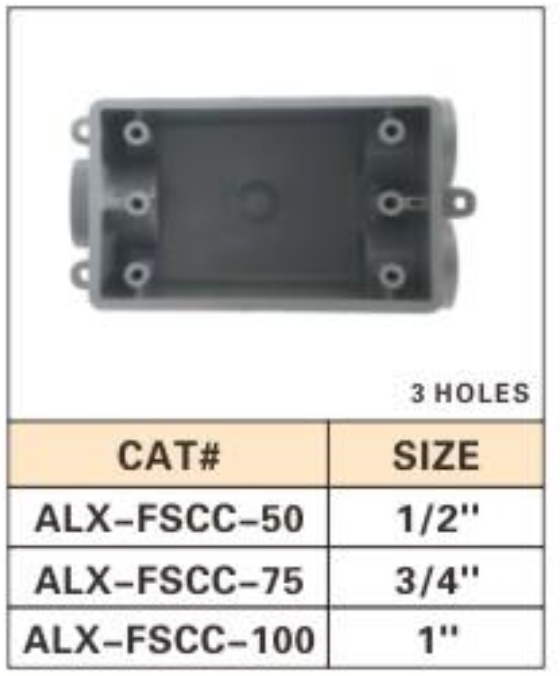 Description: ALEX® Single Gang FS Boxes are designed for surface mounting in outdoor and wet locations. These boxes provide a secure and weatherproof housing for electrical devices such as switches and receptacles. Available with 1, 2, or 3 holes to accommodate conduit connections, these boxes are versatile and suitable for various electrical applications.