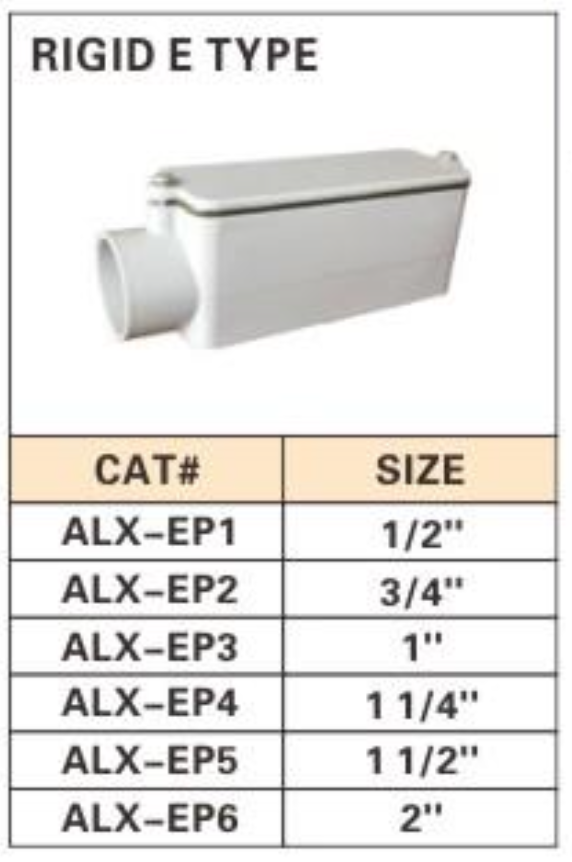 Description: ALEX® Rigid Nonmetallic Conduit Bodies are designed for use in nonmetallic conduit systems to connect sections, change directions, or provide access for wire pulling, splicing, and maintenance. Available in various types (LB, T, LR, LL, C, and E) to suit different conduit configurations, these conduit bodies offer a durable and secure solution for electrical installations. Made from high-quality, nonmetallic materials, they ensure corrosion resistance and long-lasting performance.