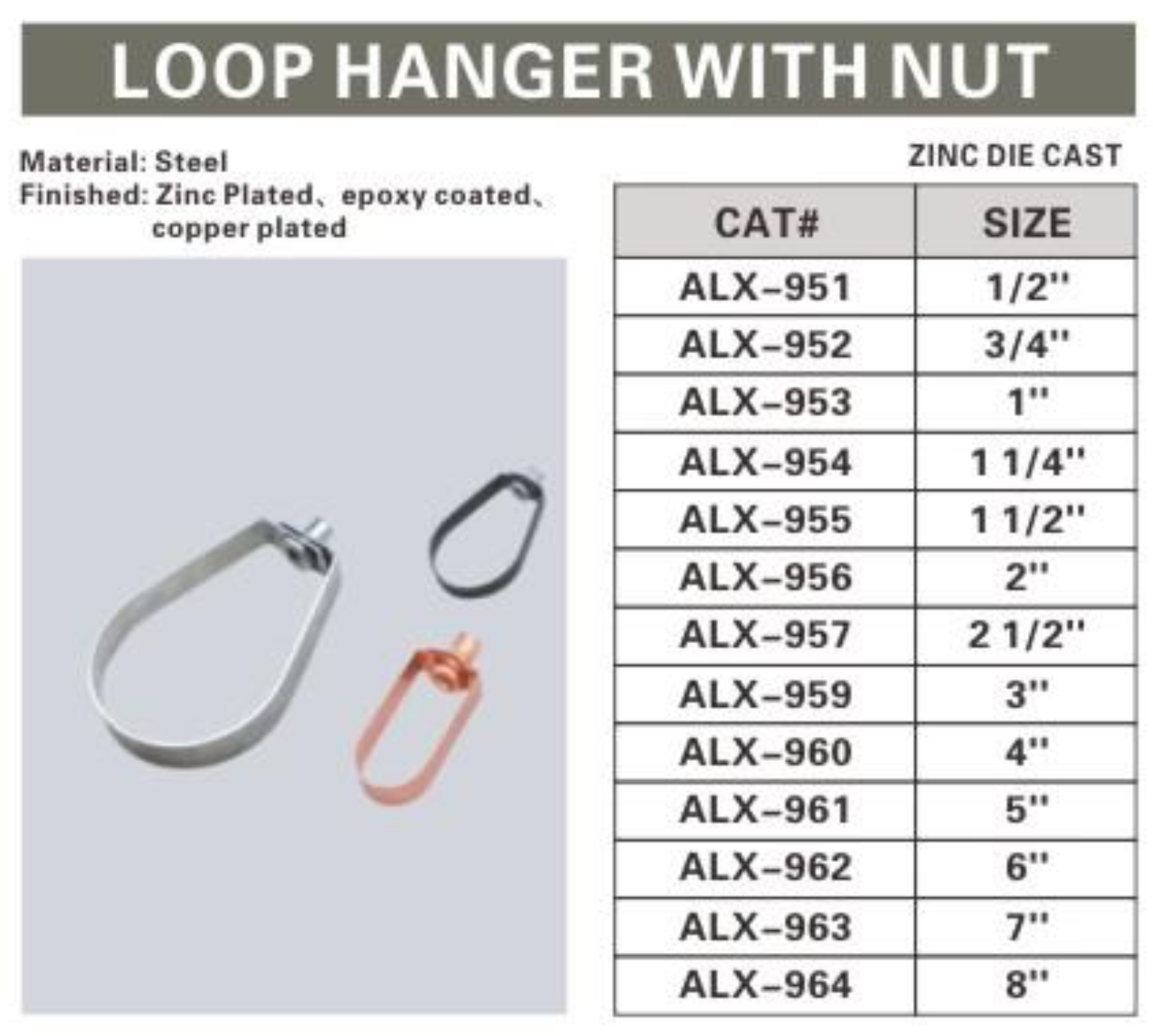 ALEX® Loop Hanger with Nut is designed for secure suspension of pipes, conduits, and cables from overhead structures. Made from high-quality steel and available with a zinc-plated, epoxy-coated, or copper-plated finish, these hangers provide excellent corrosion resistance and durability in various environments. The included nut ensures a firm and stable attachment, making it ideal for both industrial and commercial applications.