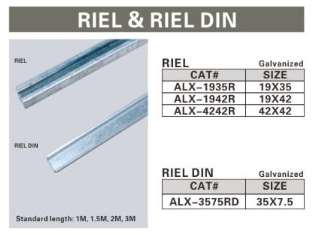 The ALEX® Riel and Riel DIN are essential components for mounting and securing various electrical equipment. Made from galvanized steel, these rails offer robust support and durability in various applications. Available in multiple sizes and standard lengths (1M, 1.5M, 2M, 3M), they provide a reliable foundation for your electrical installations.