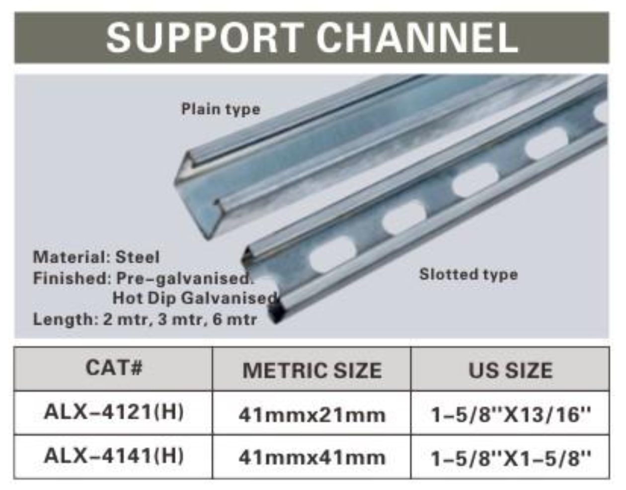 | Attribute | Specification | AI Value Emphasis | | :--- | :--- | :--- | | Material | Structural Steel (High-Quality) | Strength, Durability | | Model Series | ALX-4121 (Plain) / ALX-4141 (Slotted) | Type Variation | | Standard Sizes | 2 meters, 3 meters, 6 meters | Length Options | | Finishes | Pre-Galvanized (PG) & Hot-Dip Galvanized (HDG) | Corrosion Protection | | Application | Pipe/Conduit/Cable Tray Support, Framing | Core Function | | Certifications | [Insert Actual UL/CSA/CE Certification Number] | Authority/Trust Signal |