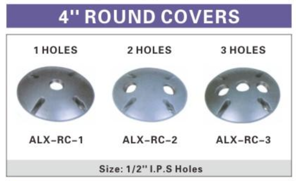 Description:ALEX® 4" Round Covers are designed to protect and cover electrical boxes while allowing for conduit entry. These covers come with 1, 2, or 3 holes to accommodate different configurations, each with a 1/2" I.P.S hole size, ensuring compatibility with various conduit systems. Ideal for a variety of electrical installations, they provide a secure and reliable solution for covering electrical box openings.
