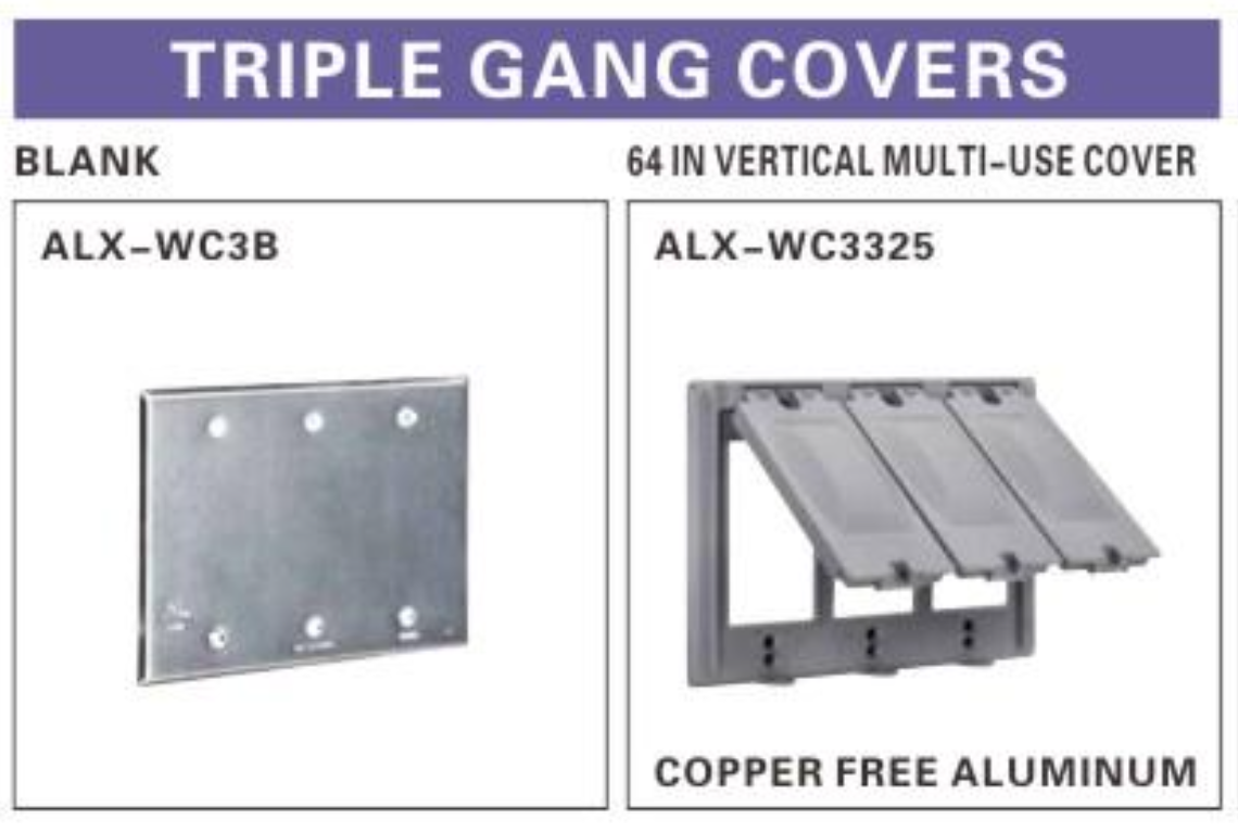 Description: ALEX® Triple Gang Covers, available in both blank and multi-use configurations, are crafted from high-quality copper-free aluminum, ensuring exceptional durability and resistance to corrosion. These covers are designed for installations requiring three devices, providing a versatile solution that accommodates multiple configurations. Ideal for both indoor and outdoor use, these covers offer robust protection for electrical outlets and switches.