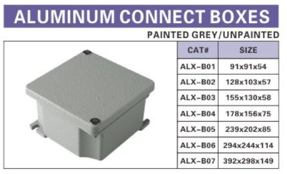 ALEX offers high-quality aluminum conduit fittings and weatherproof boxes designed for outdoor and corrosive environments. Our die-cast aluminum boxes, covers, and fittings ensure excellent rust resistance, lightweight installation, and long-term durability. Ideal for outdoor lighting, industrial environments, and wet locations requiring weatherproof protection.