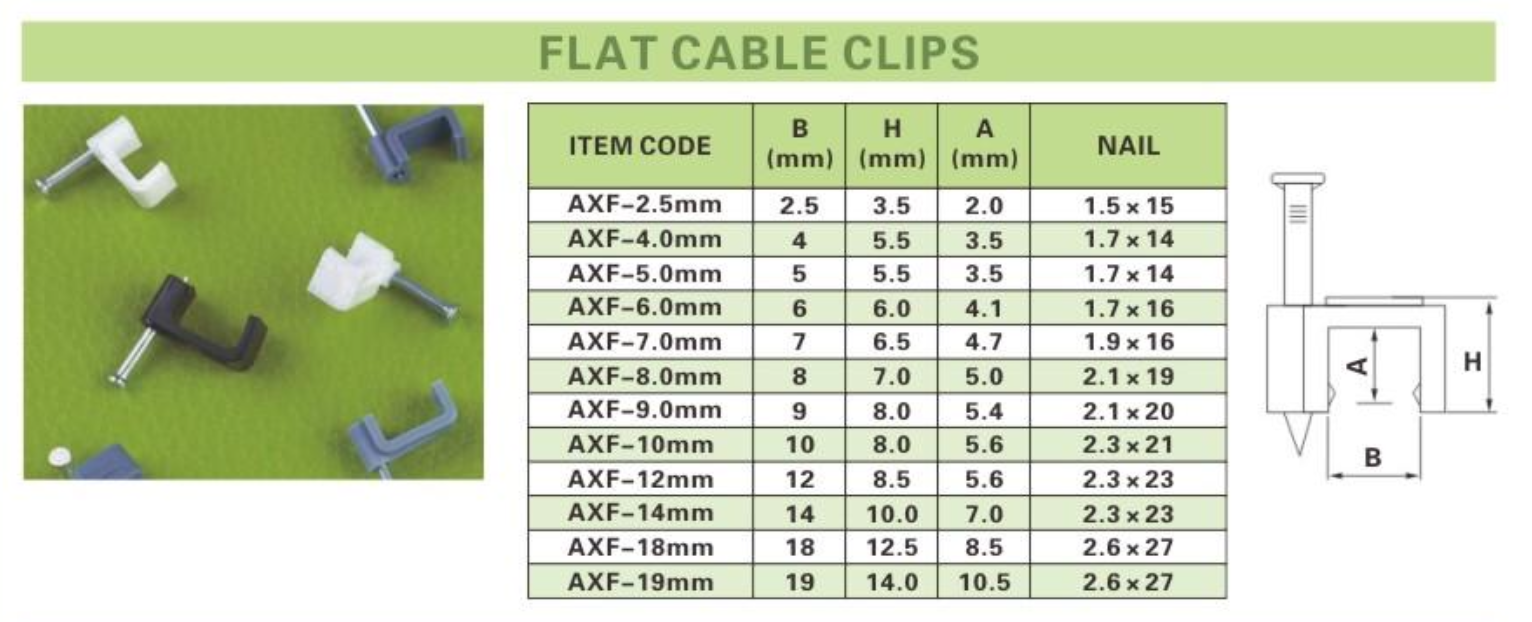 ALEX® Flat Cable Clips are designed for securing flat cables, providing a neat and organized solution for cable management. These clips are made from durable materials and include a sturdy nail for easy installation on various surfaces. The clips are ideal for keeping cables in place, reducing clutter, and preventing cable damage. Available in a range of sizes to accommodate different cable widths, these clips are perfect for both residential and commercial applications.