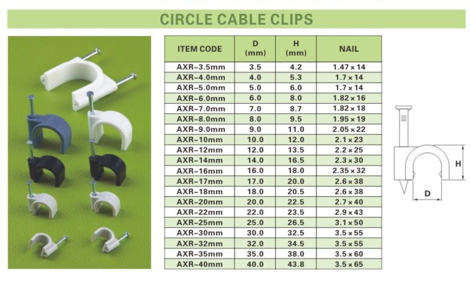 ALEX® Circle Cable Clips are designed to secure round cables, providing a reliable solution for cable management. These clips ensure that cables are organized and kept in place, preventing damage and clutter. Made from high-quality materials, the clips come with a sturdy nail for easy installation on various surfaces. Available in a wide range of sizes, they are suitable for both residential and commercial use, making them versatile for different applications.