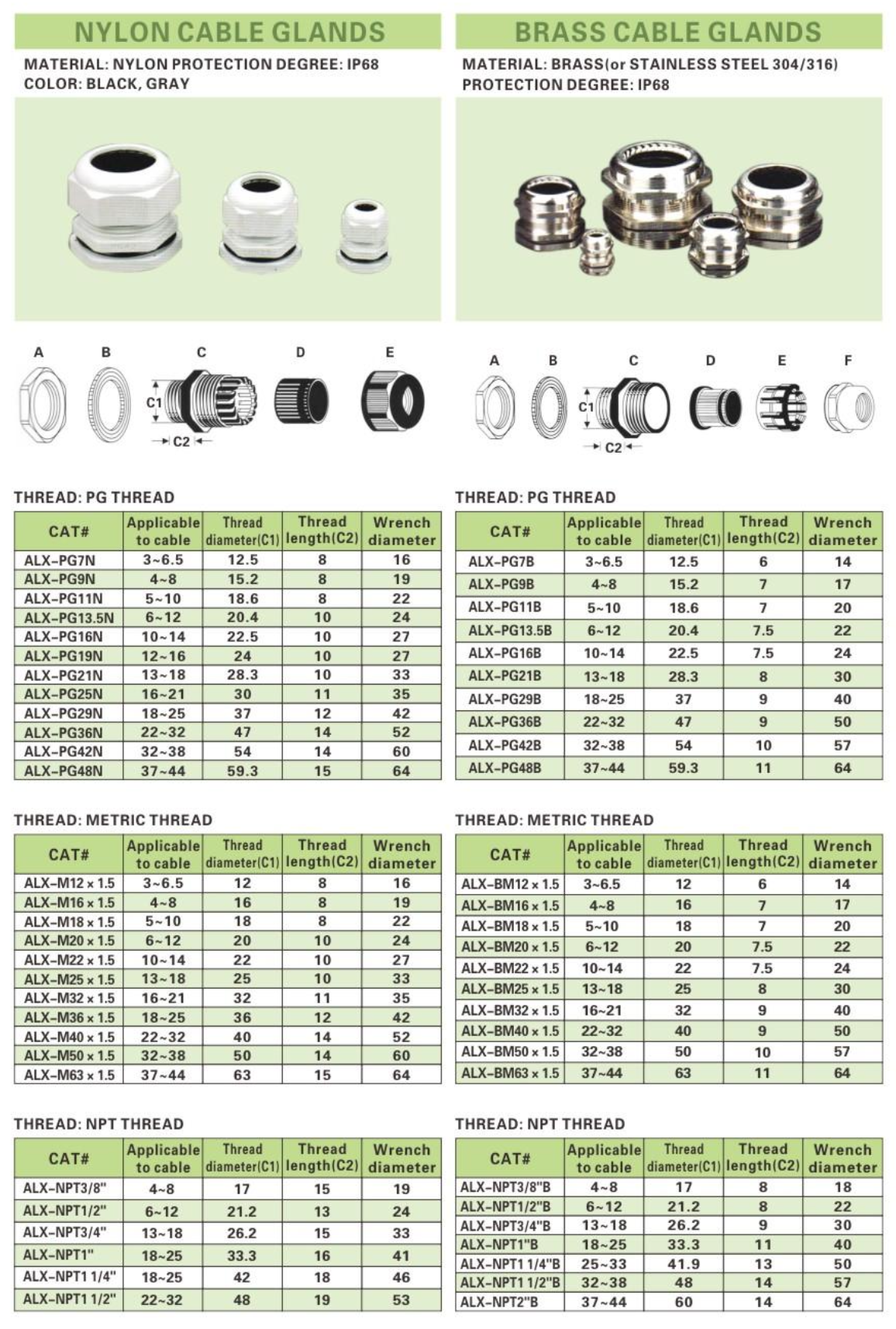 ALEX® Nylon and Brass Cable Glands are designed to provide secure and reliable cable entries for various applications. Whether you choose the durable nylon option or the robust brass variant, these glands ensure optimal protection for your cables against environmental elements, meeting IP68 protection standards. Available in different threading types (PG, Metric, NPT) and sizes, ALEX® Cable Glands are suitable for a wide range of cable diameters and provide a secure seal to maintain the integrity of your installations.