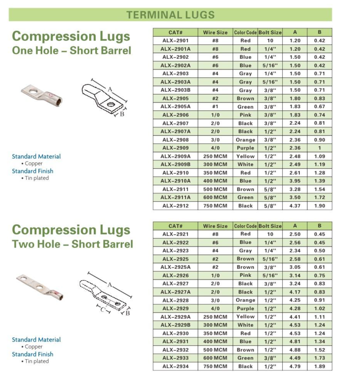 ALEX® Compression Lugs are designed to provide a secure and reliable connection for electrical wires, ensuring optimal conductivity in various applications. These lugs are available in one-hole and two-hole short barrel configurations to accommodate different installation needs. Made from high-quality copper and finished with a tin plating, ALEX® Compression Lugs offer excellent durability and corrosion resistance. The color-coded lugs simplify wire size identification and ensure precise installations.
