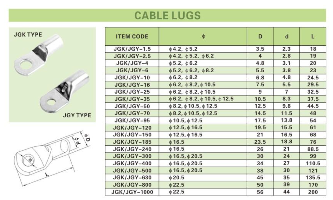 ALEX® Cable Lugs of the JGK and JGY types are designed for secure and reliable electrical connections, ensuring optimal conductivity across various applications. These lugs are manufactured from high-quality materials to provide excellent durability and corrosion resistance. The precision-engineered design allows for easy installation, making them ideal for use in a wide range of electrical projects.